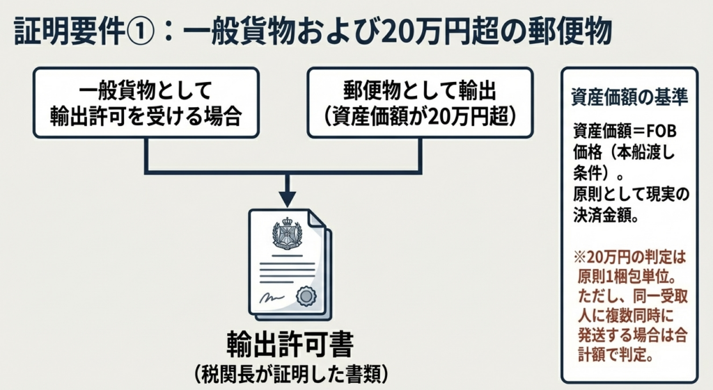 設問7: 資産価額が20万円を超える物品を郵便物として輸出する場合、どのような証明書類が必要ですか。