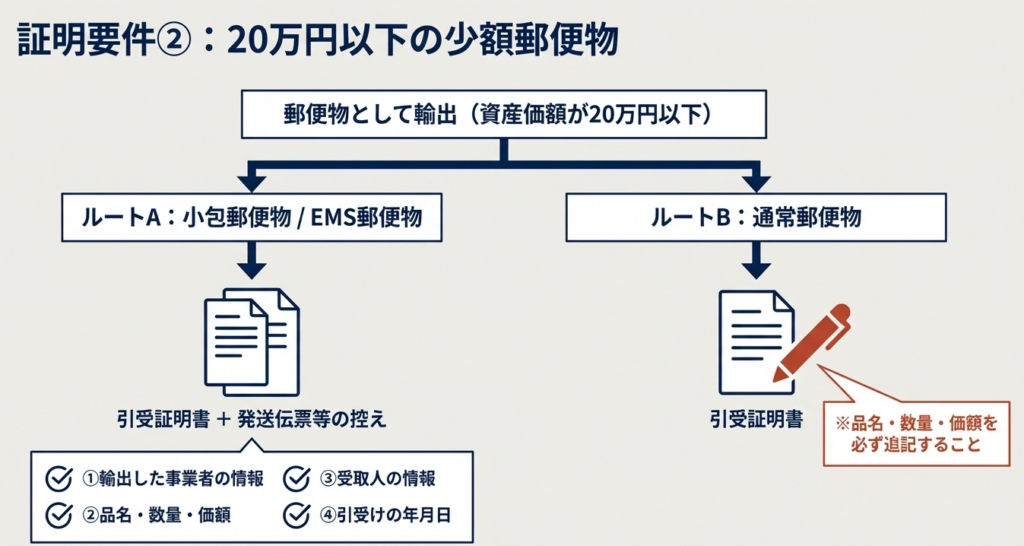 | 通常郵便物(20万円以下) | 引受けを証する書類(品名・数量・価額を追記したもの) |
