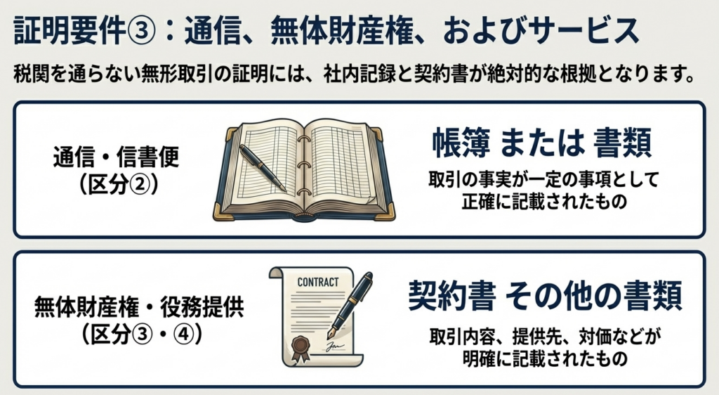| 通信・役務・無体財産権 | 契約書その他の書類(相手方、内容、対価の記載があるもの) |