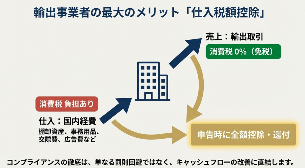 実務上、この制度が極めて重要なのは、単なる「非課税(課税対象外)」ではなく、「免税(0%課税)」として扱われる点にあります。この違いは財務上のキャッシュフロー、とりわけ「還付」の可否に直結します。