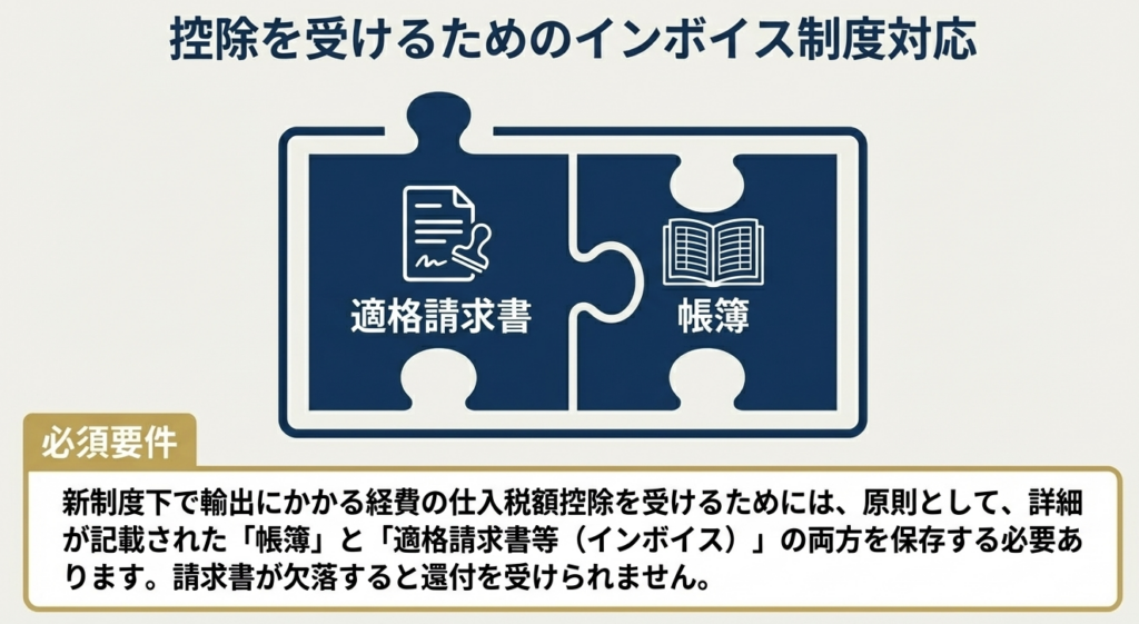 輸出許可書や発送伝票控えは、電子帳簿保存法の要件を満たす形で管理してください。原本または適切な電子データの欠落は即、否認に直結します。 - インボイス制度との連動: