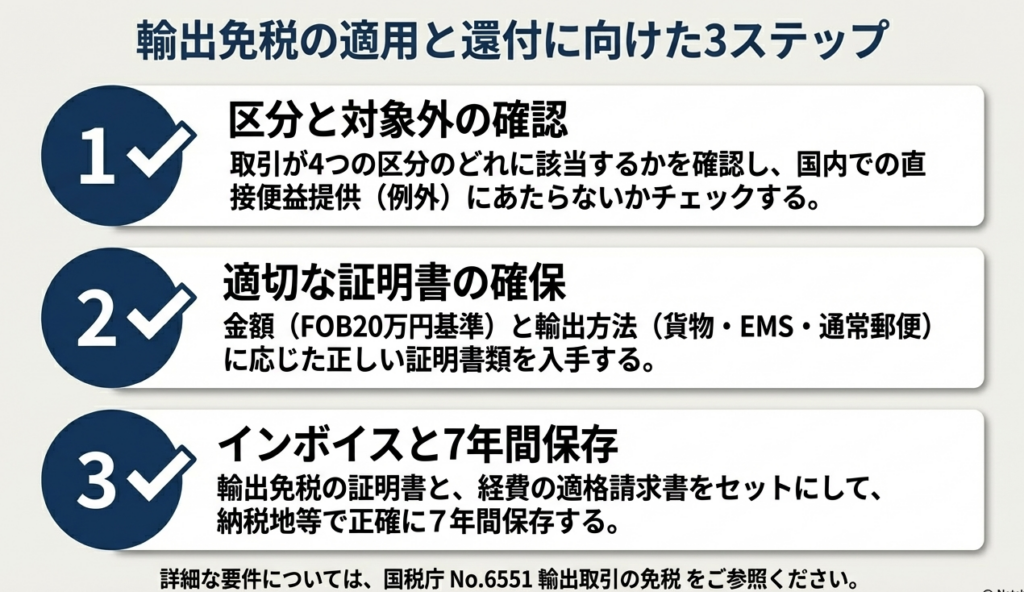 輸出売上が免税であっても、それに対応する国内仕入について控除を受けるには、原則として適格請求書(インボイス)の保存が不可欠です。「売上の免税証明」と「仕入のインボイス」はセットで管理してください。 - 判定のロジック構築: