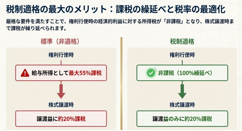 税制適格ストックオプション(以下「税制適格SO」)の戦略的意義は、権利行使時(株式取得時)の給与所得課税(最高税率約55%)を繰り延べ、将来の株式売却時まで課税を猶予した上で、約20%の譲渡所得課税に一本化できる点にあります。