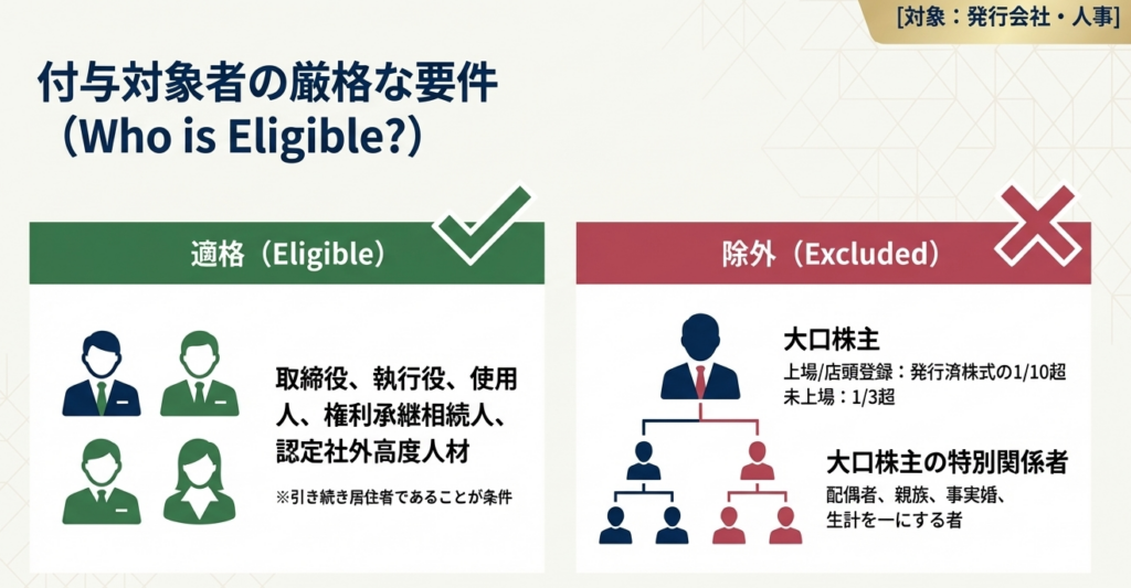 対象は、発行会社およびその50%超子会社の取締役、執行役、使用人です。令和6年の改正により、認定計画に従事する「社外高度人材(特定従事者)」への対象拡大が維持されていますが、特定従事者については「実施時期の開始の日から行使の日まで引き続き居住者であること」が厳格な要件となります(措置法第29条の2第1項)。
