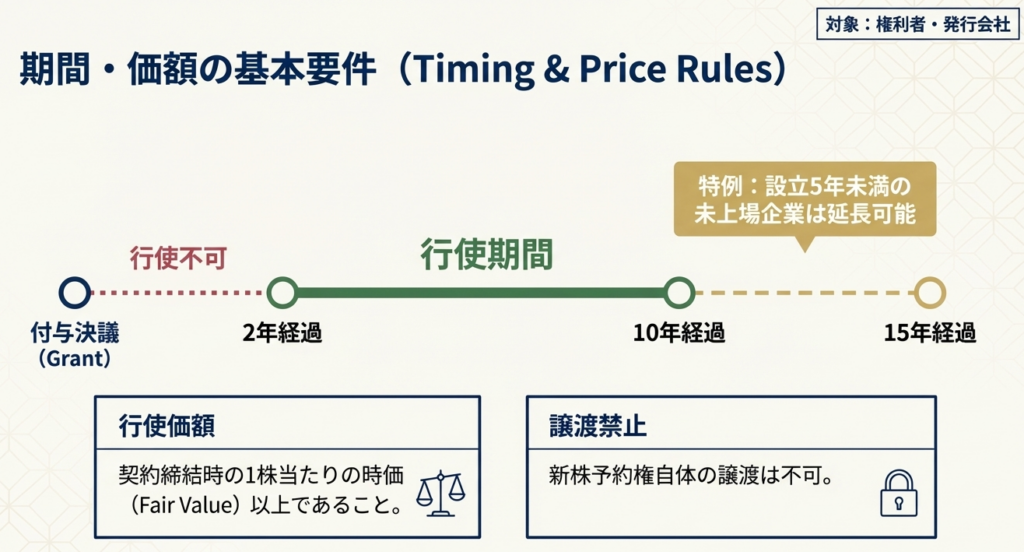 1. 権利行使期間: 原則として付与決議の日から2年経過後から10年を経過する日までの間(設立5年未満のスタートアップ企業等の場合は最長15年)に行使すること。