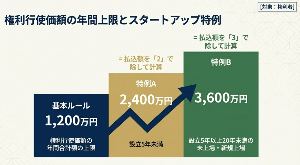 さらに、今回の改正における最大の「So What?(戦略的帰結)」は、年間行使価額の限度額(1,200万円)の計算方法の変更です。後述する「設立年数に応じた除数(2または3)」の導入により、実質的な行使枠が最大3,600万円まで拡大されました。これはスタートアップの人材獲得競争において、他社を圧倒する強力な武器となります。