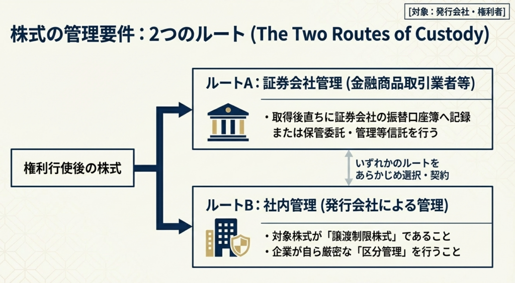 原則は証券会社等への保管委託ですが、譲渡制限株式の場合は、発行会社による「区分管理(自社管理)」が認められます(措置法第29条の2第1項第6号ロ)。