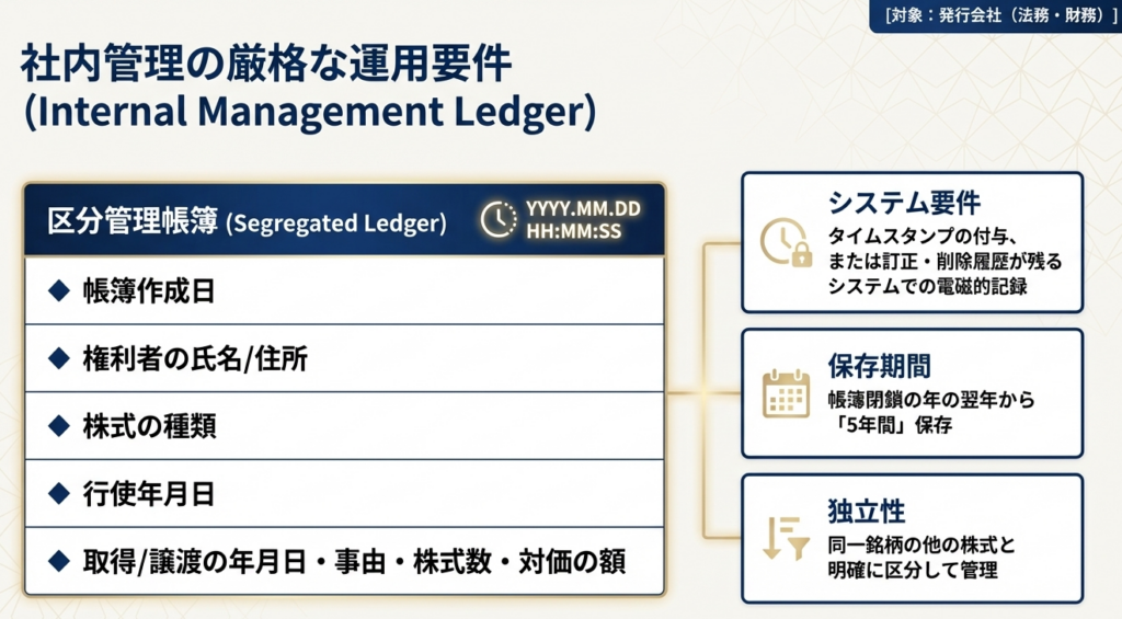 証券会社を通さない自社管理を選択する場合、経済産業省告示第69号に基づく「区分管理帳簿」の作成・保存が必須となります。