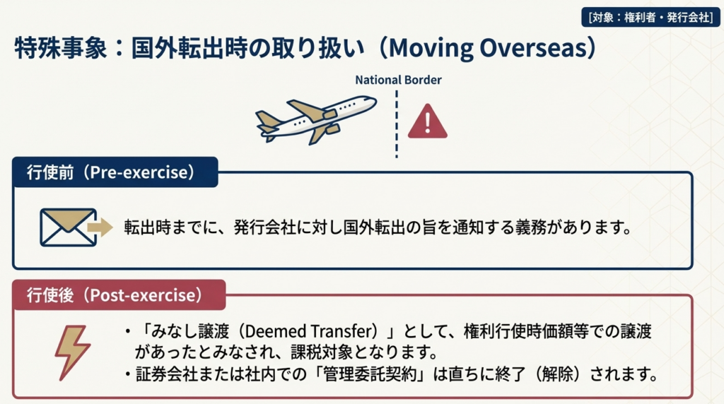 権利者が国外転出(非居住者化)する場合、その時点で特定株式の譲渡があったものとみなされる「出口税」的な処理(措置法第29条の2第5項)が発生します。特に特定従事者の場合、行使までの居住継続が必須要件であるため、グローバル人材の起用時には転居予定のモニタリングが不可欠です。