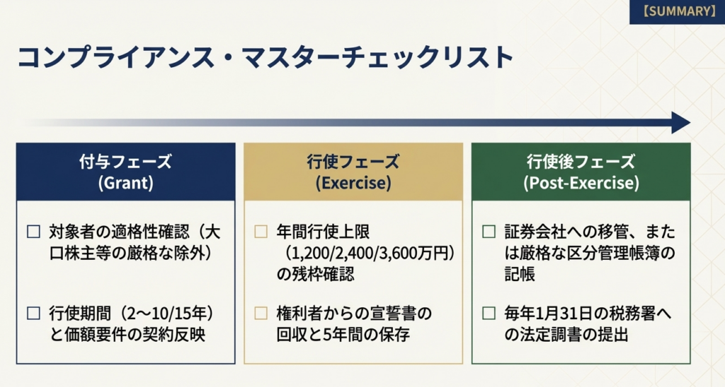 5. 取得株式の適切な管理: 行使により取得した株式は、ただちに証券会社等(金融商品取引業者等)の口座で保管・管理を委託するか、発行会社自身が要件を満たす区分管理帳簿を備えて厳格に管理すること。