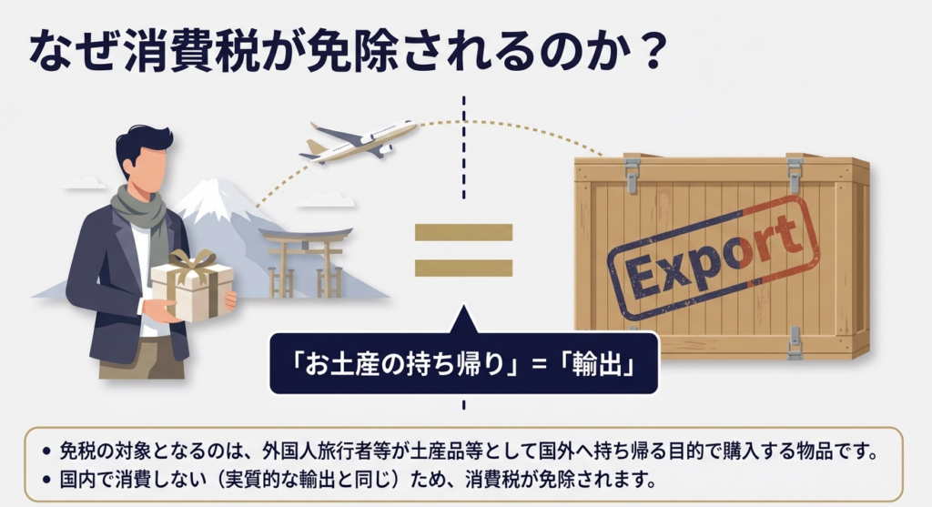 免税購入対象者が土産品等を国外へ持ち帰ることは、実質的に輸出と同じであるとみなされるためです。そのため、輸出に準ずる取引として消費税を免除する制度が設けられています。