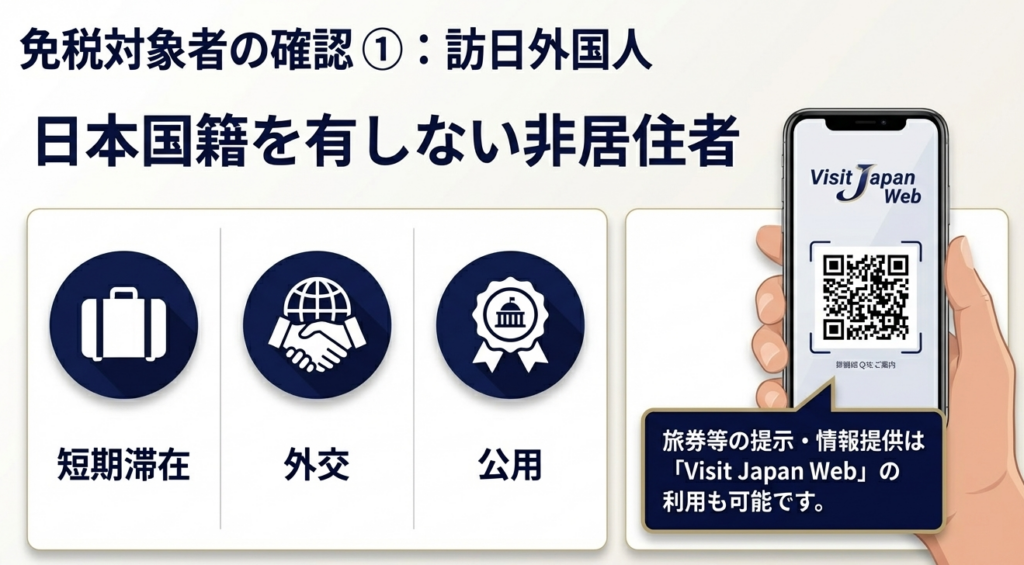 出入国管理及び難民認定法に規定される「短期滞在」、「外交」、または「公用」の在留資格を有する等の非居住者であることが条件です。これに該当しない場合は、日本国籍がなくても免税対象とはなりません。