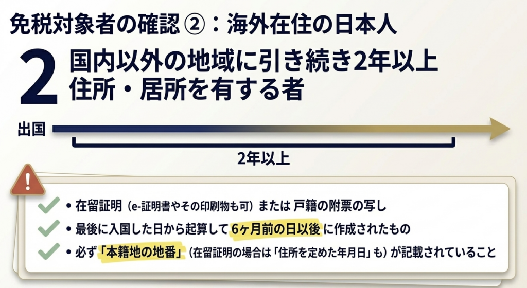 日本人の場合、在留証明等に「本籍地の地番」の記載があるか? 書類は入国日から「6月前の日」以後の作成か? - 非対象物品の除外:
