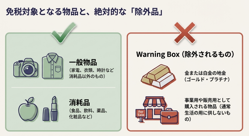 免税対象は通常生活に使う物品で、事業用や販売用、金・白金の地金は除かれます。