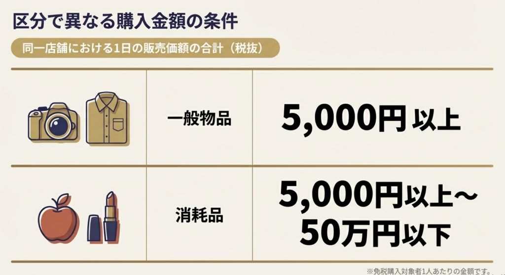 免税になる金額基準は、家電などの「一般物品」が1店舗につき1日合計5,000円以上、食品や化粧品などの「消耗品」は5,000円以上50万円以下です。
