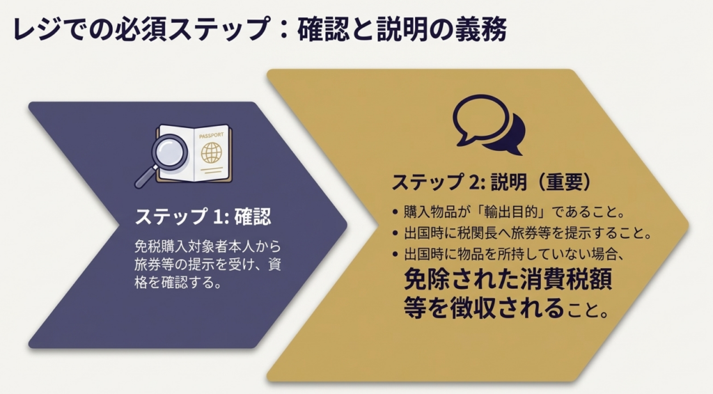 購入物品が輸出用であること、出国時に税関長へ旅券等を提示する必要があること、および出国時に物品を所持していない場合は免除された消費税額等が徴収されることを説明する必要があります。