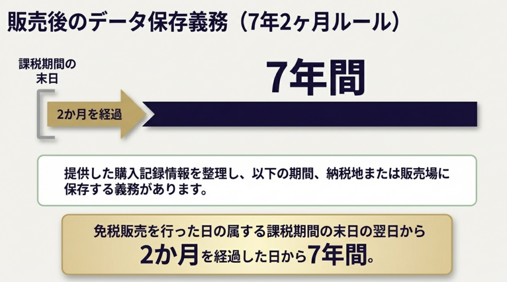 免税販売を行った日の属する課税期間の末日の翌日から2か月を経過した日から起算して、7年間保存する必要があります。保存場所は、納税地または輸出物品販売場の所在地です。