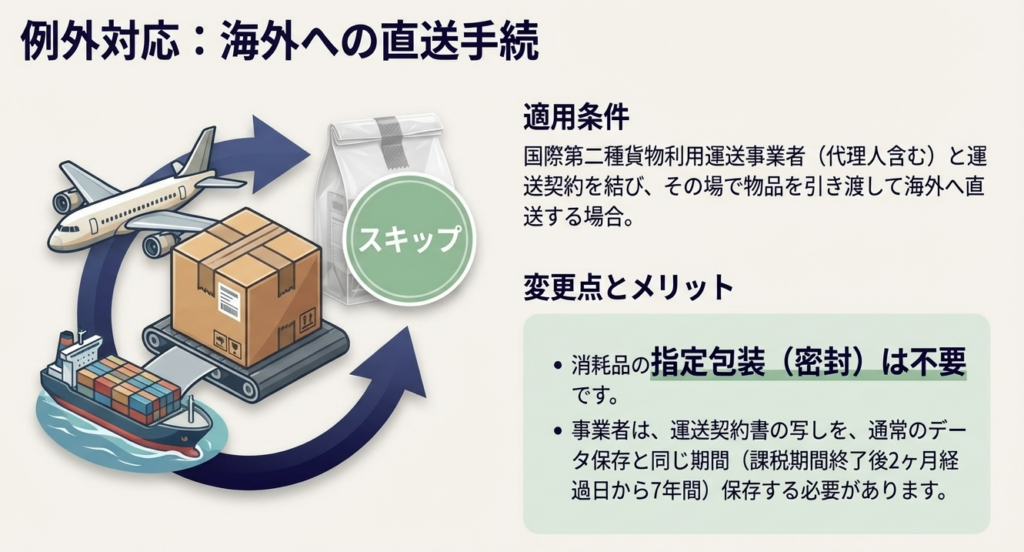 購入者が「国際第二種貨物利用運送事業者」と運送契約を結び、販売場から直接海外へ発送する場合、消耗品の指定包装義務は免除されます。この際、事業者は「運送契約書の写し」を唯一の証憑として7年間保存しなければなりません。