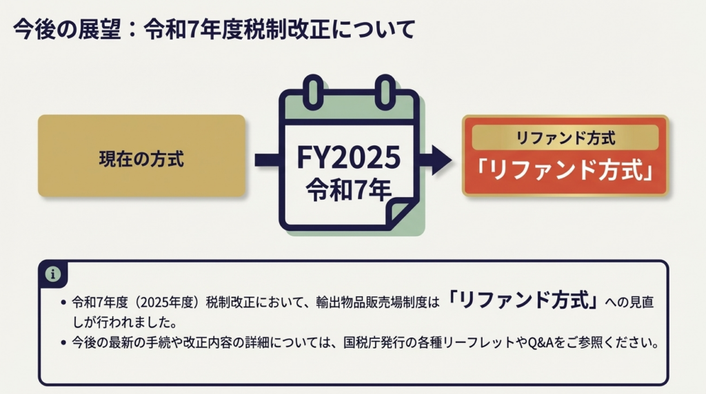 2025年度税制改正で店頭では一旦税込価格で販売し、出国時に税関等で還付を受ける「リファンド方式(事後還付方式)」への移行しました。これは現場のオペレーションを根本から変えるものです。POSシステムの改修予算の確保や、スタッフの再教育など、今から中期的な準備を進めておく必要があります。