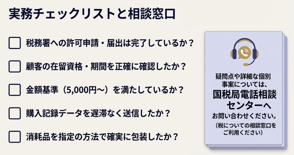 免税販売は、適切な証憑保存があって初めて成り立つ「特権」です。以下のチェックリストを日々の業務に組み込み、リスクを最小化してください。