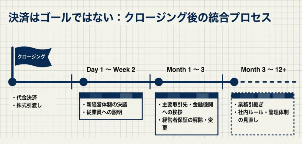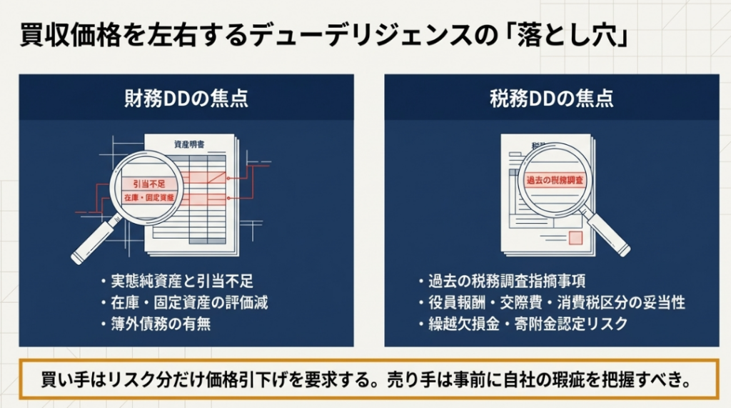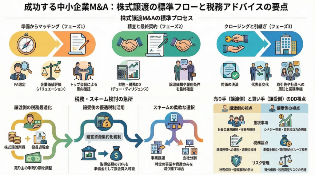 譲渡価格の考え方、基本合意の内容、デューデリジェンスへの対応、最終契約での税務リスクの整理、クロージング後の社内外対応まで、実務上確認すべき論点が幅広くあります。