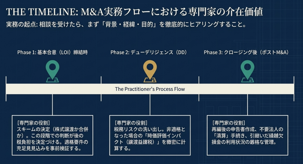 実務でM&Aの相談を受けた際、まず「背景・経緯・目的」を徹底的にヒアリングしてください。中小M&Aのフローにおいては、特に以下の段階で我々税理士の価値が問われます。