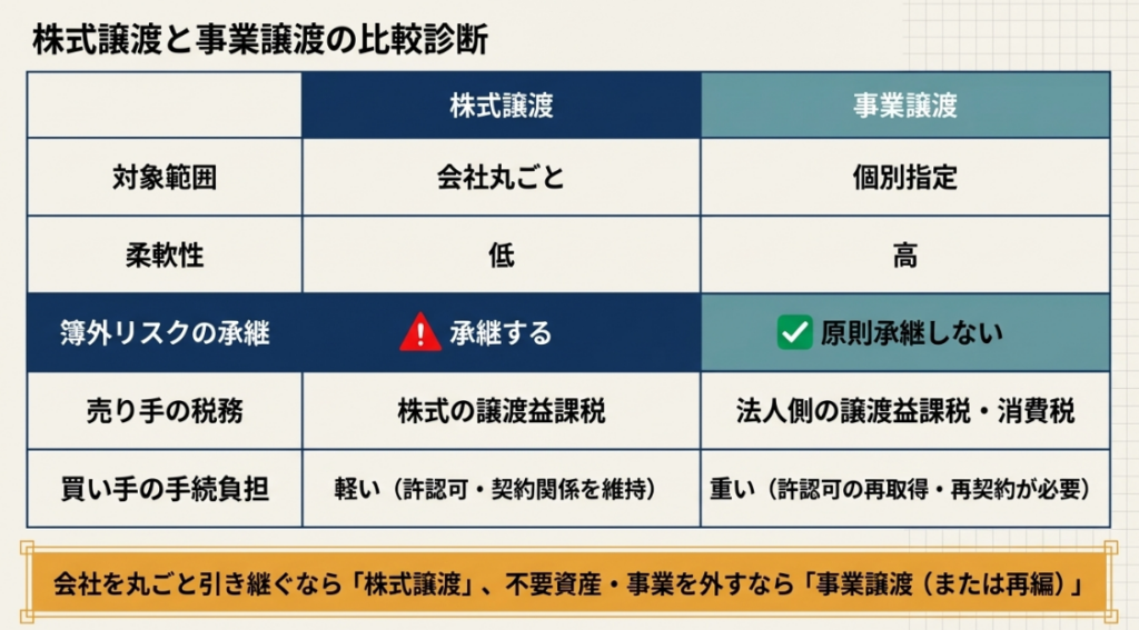 また、株式譲渡は、事業譲渡と比べて許認可や取引関係を引き継ぎやすい一方で、会社の中にある簿外債務や過去の税務リスクもまとめて承継しやすいという特徴があります。だからこそ、税務・会計の視点から全体像を理解しておくことが欠かせません。