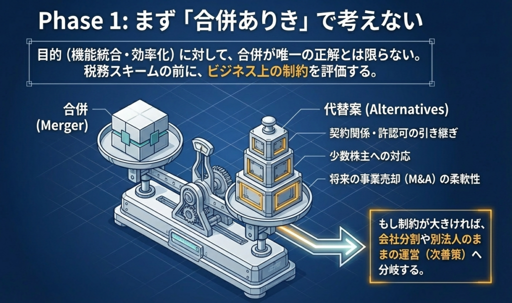 ここで決定する「スキーム(株式譲渡か合併か等)」が後の税負担を決定づけます。適格要件の充足見込みをこの段階で検証します。