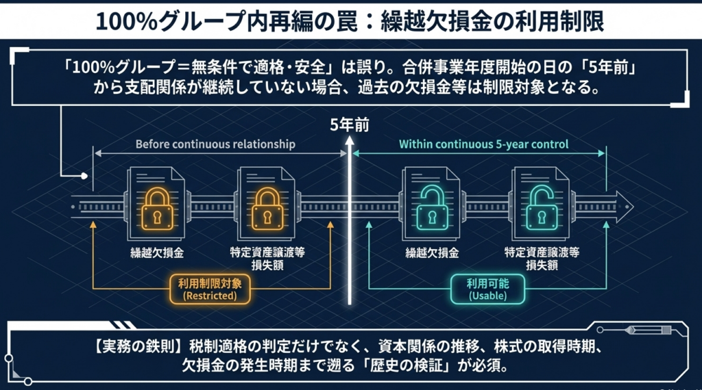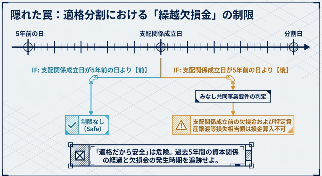 さらに、適格分割でも繰越欠損金の使用制限等を必ず確認することです。グループ内再編であっても、過去の支配関係や欠損金の発生時期によっては制限がかかります。