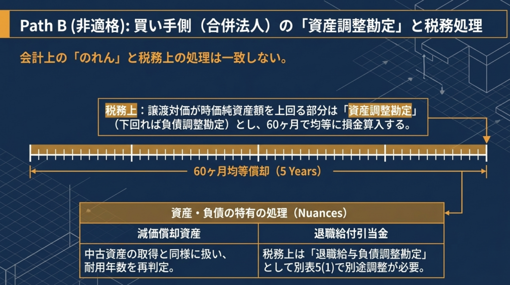 また、非適格で取得した減価償却資産は、適格分割のように税務属性をそのまま引き継ぐわけではなく、中古資産取得に近い考え方になります。このため、のれんの会計処理と税務上の資産調整勘定の取扱いがずれる場面もあり、申告調整が欠かせません。