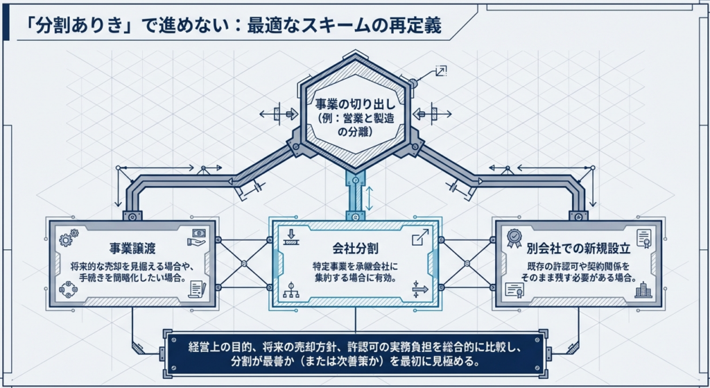 たとえば、特定事業だけを承継会社に集約したいのであれば分割が有効ですが、将来その会社ごと売却したい、許認可や契約関係を別の形で残したい、といった事情があるなら、別の再編手法の方が合うこともあります。