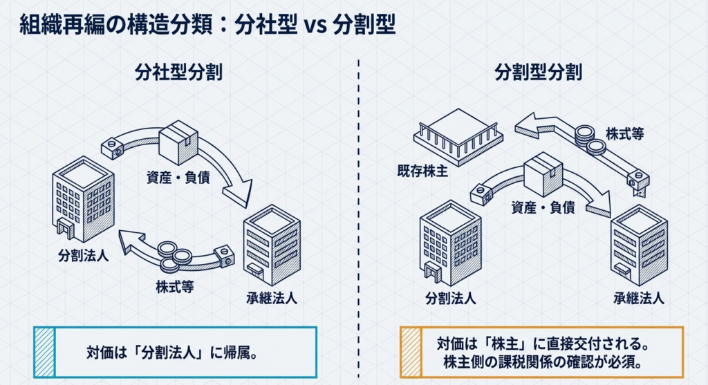 分割の対価を「分割法人(元の会社)」が受け取る場合を分社型分割と呼び、対価を「分割法人の株主」が受け取る場合を分割型分割と呼びます。これは対価の帰属先による区分であり、法人税法上の規定(第2条12の9、12の10)に基づいています。