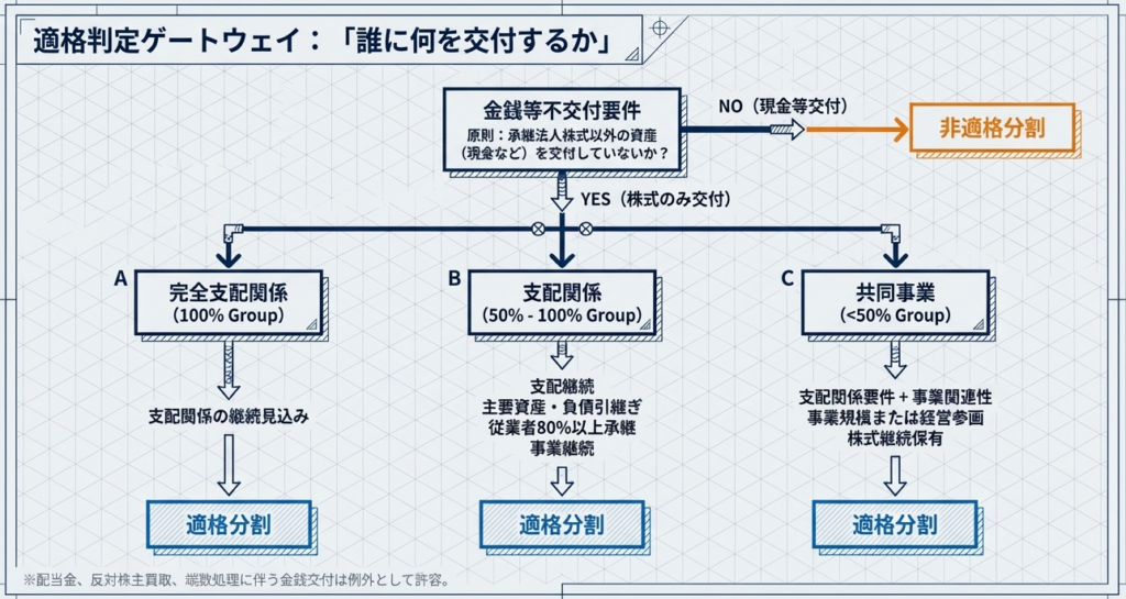 適格分割の判定では、まず金銭等不交付要件が重要になります。つまり、原則として承継法人株式等以外の資産を交付しないことが必要です。もっとも、配当金として交付される金銭や反対株主への買取対価、1株未満端数の処理に伴う金銭は例外扱いです。