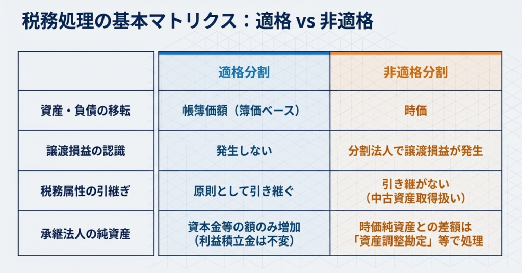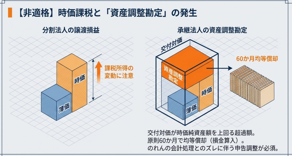 適格分割であれば、原則として移転資産・負債は簿価ベースで引き継ぐ考え方になります。一方、非適格分割では、分割法人側で時価譲渡として損益を認識し、承継法人側でも時価ベースの受入処理が必要になります。