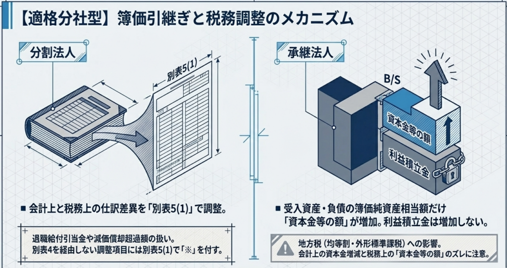 会計上はそのまま引き継いでいるように見えても、税務上は損金算入の可否や税務簿価の考え方が異なるため、別表4を経由しない調整や、利益積立金額の調整が必要になることがあります。