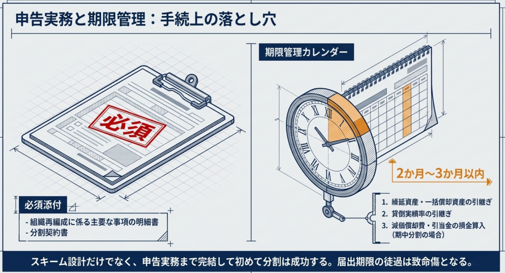さらに、適格分割では、繰延資産、一括償却資産、貸倒実績率、繰延消費税額等、外国税額控除などの引継ぎについて、原則として分割後2か月以内または3か月以内の届出が必要になるものがあります。加えて、期中分割の場合に期首から分割日までの減価償却費や引当金などを分割法人で損金算入するには、別途届出が必要です。