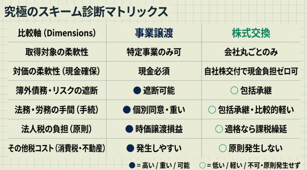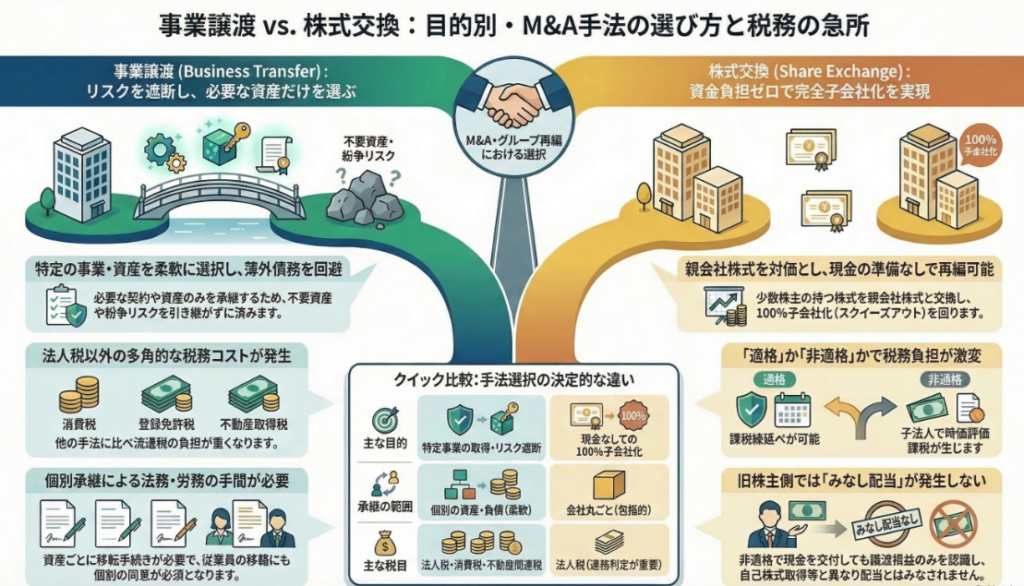 会計事務所スタッフや企業経理担当者の実務としては、まず「何を取得したいのか」「何を引き受けたくないのか」を整理し、そのうえで事業譲渡か株式交換かを比較する姿勢が重要です。