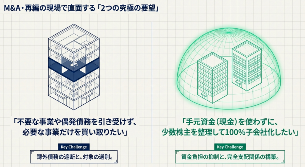 M&Aやグループ再編の実務では、「会社を丸ごと買うべきか、それとも必要な事業だけ切り出して取得すべきか」「現金を使わずに子会社化できないか」という相談がよく出てきます。