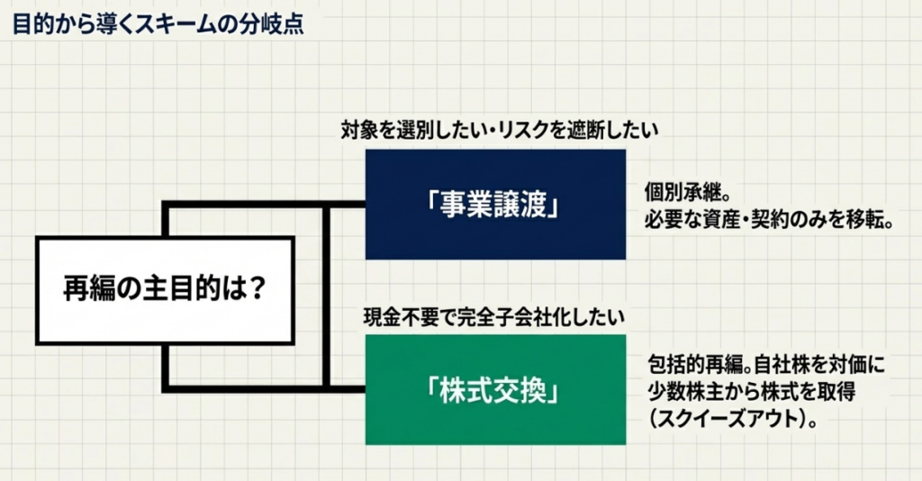 通常の売買契約による事業の譲渡。会社分割が「包括承継」であるのに対し、事業譲渡は「個別取引」です。 - 株式交換:
