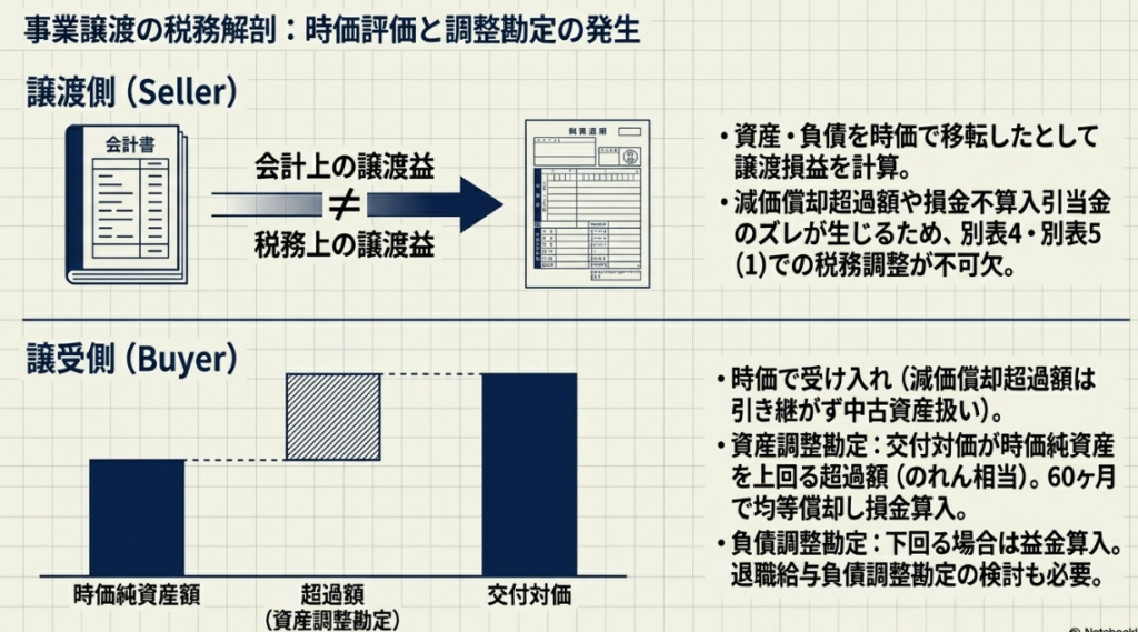 譲渡法人側では、事業譲渡を行った事業年度で通常どおり所得計算を行い、譲渡した資産・負債を時価で移転したものとして譲渡損益を計算します。つまり、会計上の譲渡益がそのまま税務の結論になるとは限らず、減価償却超過額や損金不算入の引当金などを踏まえた税務調整が必要です。譲渡益の計算だけでなく、別表4と別表5(1)への整理が重要な論点となります。
