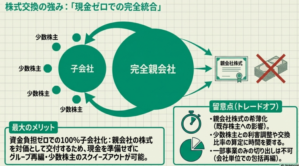 株式交換の強みは、親会社が現金を準備しなくても完全子会社化を進めやすいことです。