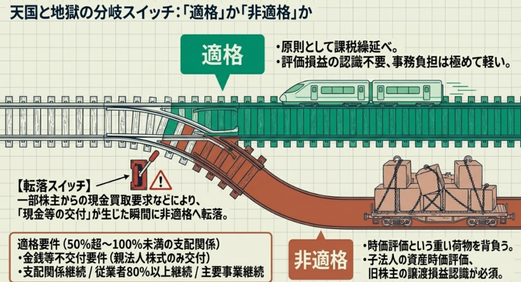 - 主な要件:金銭等不交付要件(対価が株式のみ)、完全支配関係継続要件。