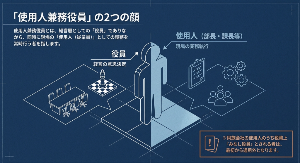 使用人兼務役員とは、役員のうち部長、課長、その他法人の使用人としての職制上の地位を有し、かつ、常時使用人としての職務に従事する者を指します。ただし、法令で定められた特定の地位にある者や、一定の所有割合を持つ同族会社の役員などは、この範囲から除外されます。