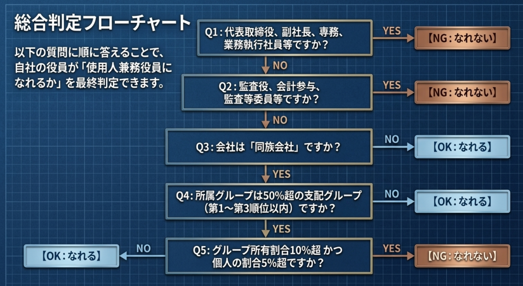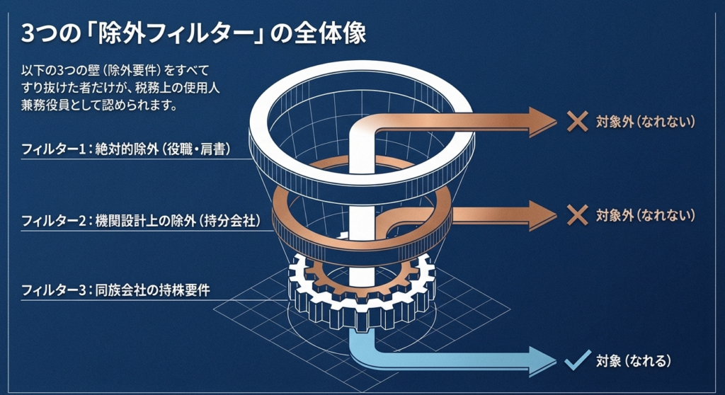 同族会社において、経営支配力を持つ株主が「使用人給与」の名目で恣意的に利益を分配し、租税回避を行うことを防ぐための最も厳格な基準です。以下の3つのステップすべてに該当する役員は、使用人兼務役員になれません。