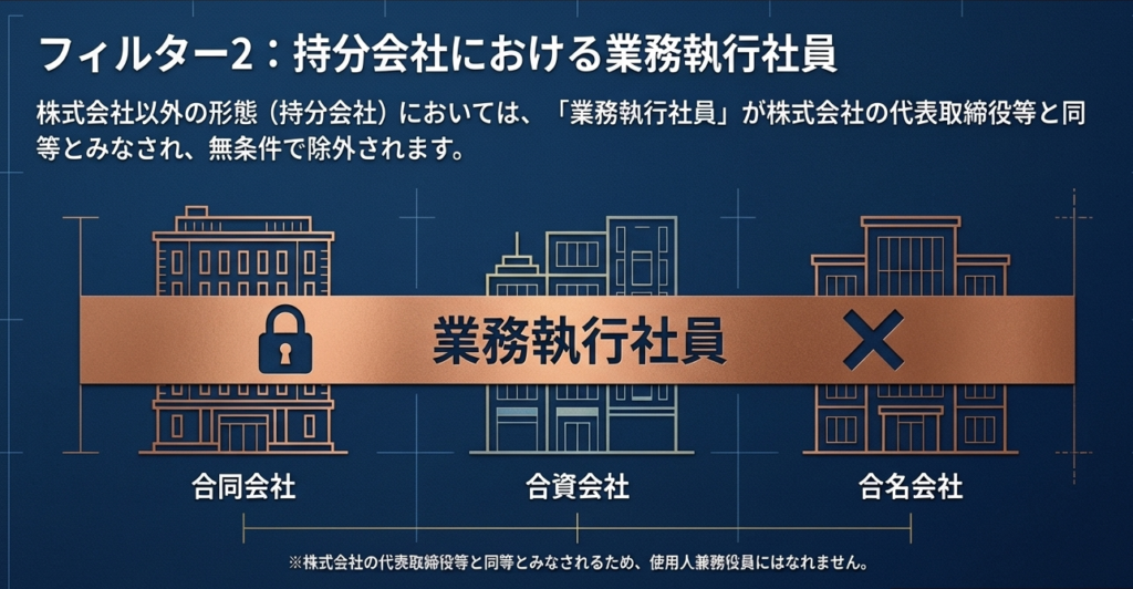 合名会社、合資会社、および合同会社においては、その法人の「業務執行社員」が使用人兼務役員になれない対象として規定されています。これらの社員は法人の業務を執行する立場にあるため、使用人の立場を兼ねる役員には該当しません。