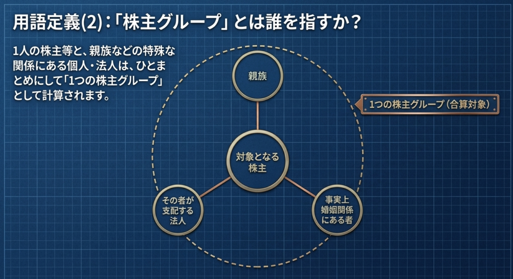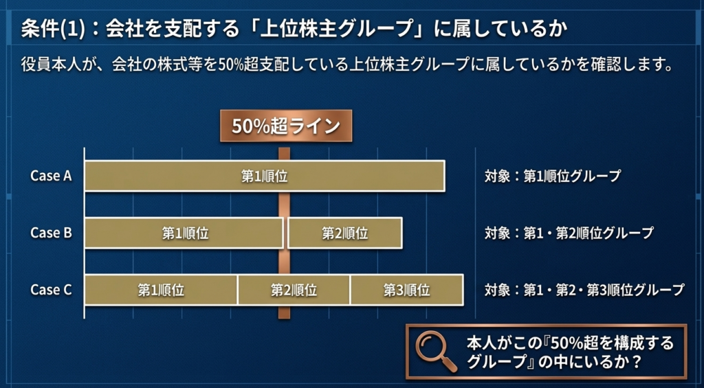 その役員が属する株主グループを所有割合の大きい順に並べたとき、第1順位のグループだけで50%超、あるいは第2順位まで、または第3順位までの合計で初めて50%を超える場合の、それら上位グループに属していることが要件の一つです。