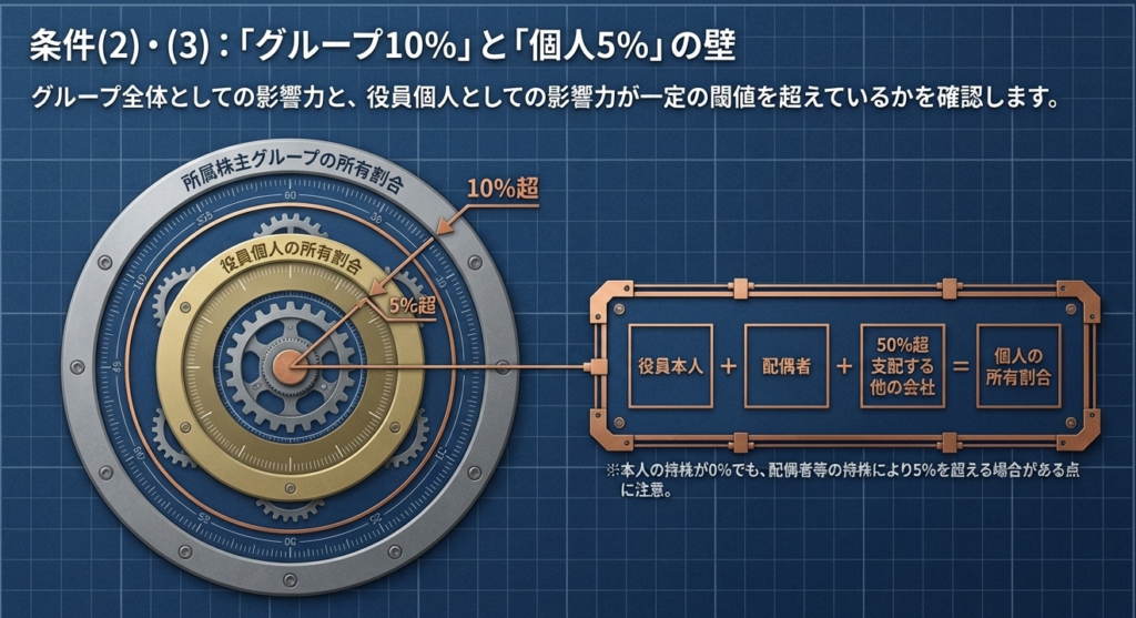 役員個人(配偶者、およびその役員・配偶者が50%超支配する別会社を含む)の所有割合が 5%超 であること。