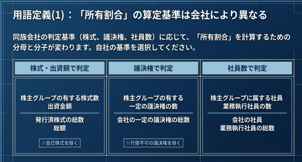 ここでいう「所有割合」は、単に株式数だけで判断してはいけません。その会社が「なぜ同族会社と判定されたか」の根拠指標に合わせる必要があります。