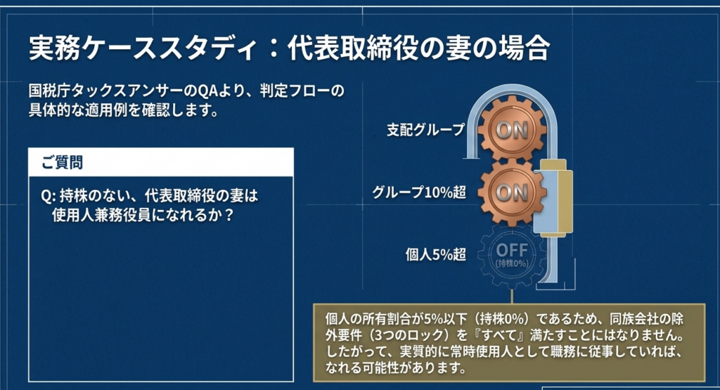 実務において最も陥りやすい罠は、「取締役営業部長」といった肩書きだけで安心してしまうことです。税務当局は形式よりも「実態」を、そして何より「数字(所有割合)」を注視しています。