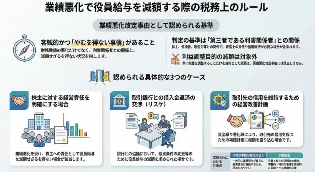 業績悪化改定事由は、単に財務数値が悪化した場合だけでなく、株主や取引銀行、取引先などとの関係上、やむを得ず減額が必要となる客観的な事情がある場合も含まれます。ただし、利益調整のみを目的とした減額は認められず、同族会社等では減額の客観的な事情を具体的に説明できるようにしておく必要があります。